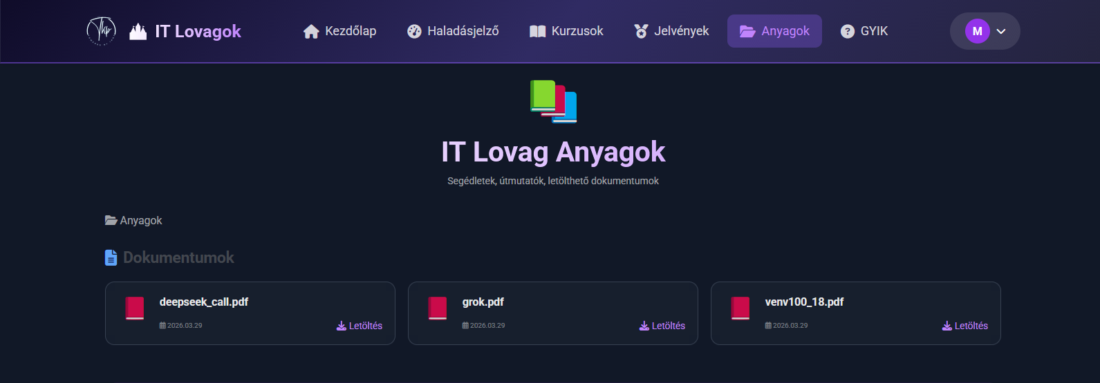 - 📁 Mappa alapú dokumentumtárat biztosít (anyagok, segédletek)