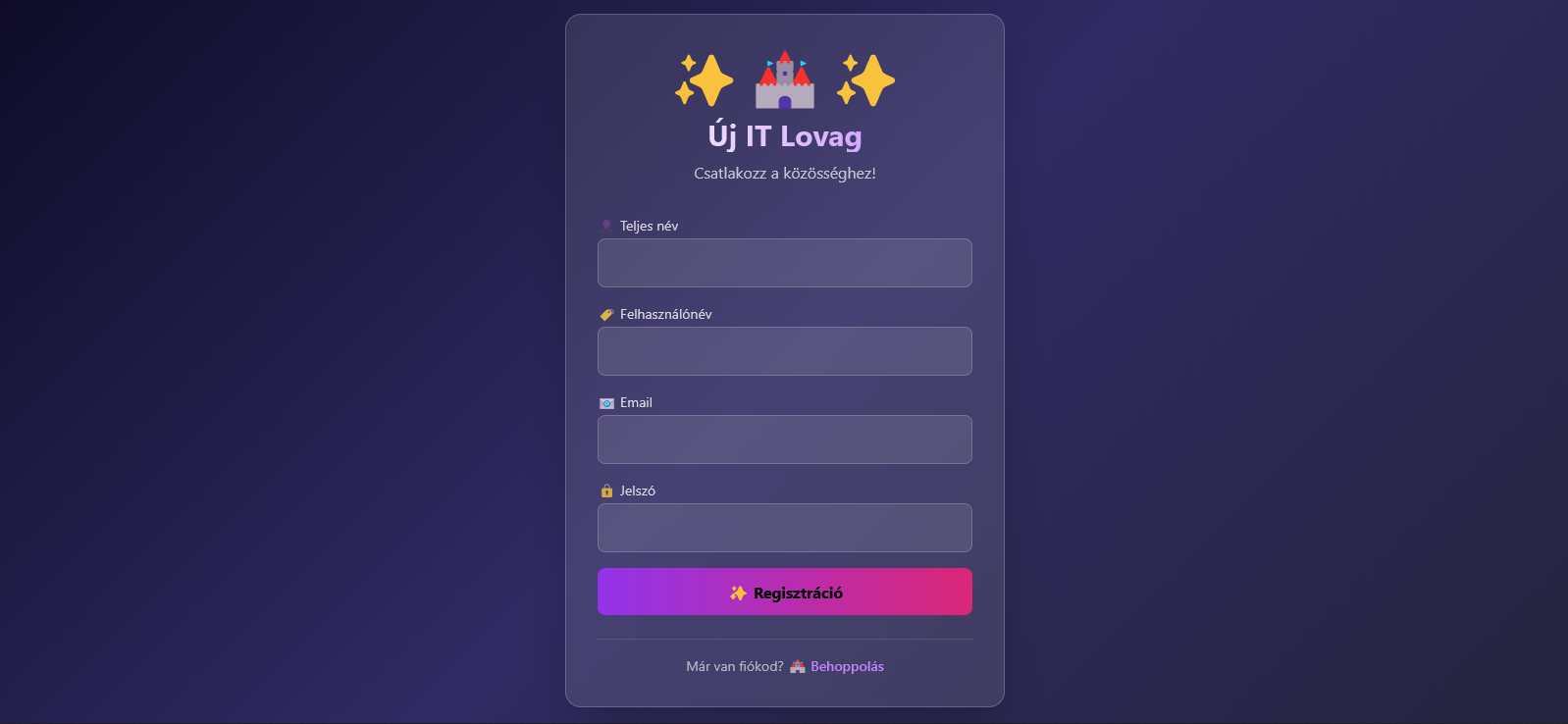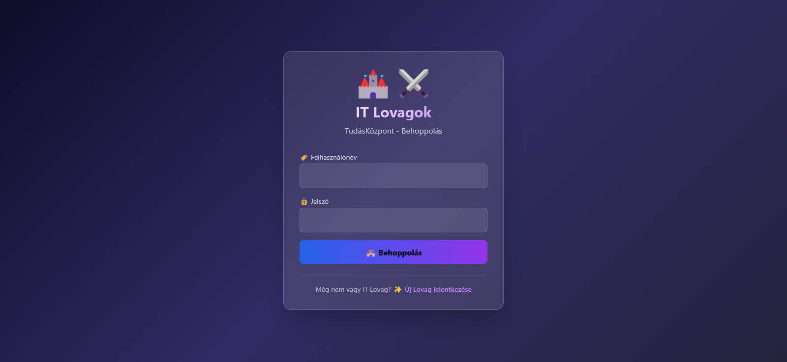 - 👤 Saját login/regisztrációt (/behopp/, /ujitlovag/)