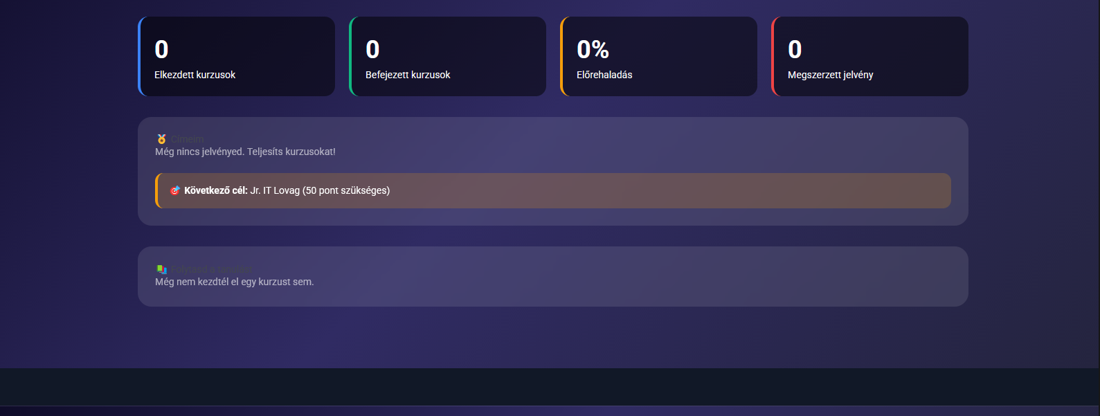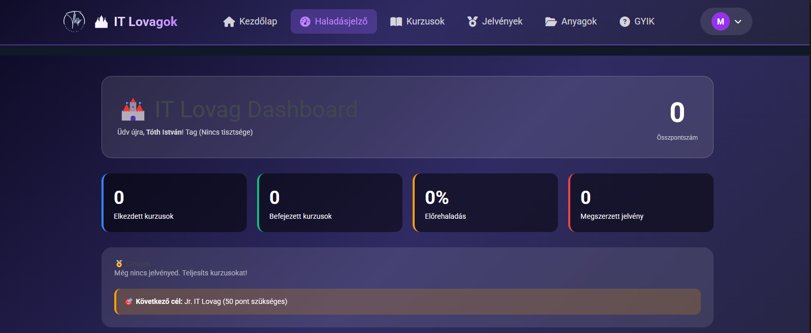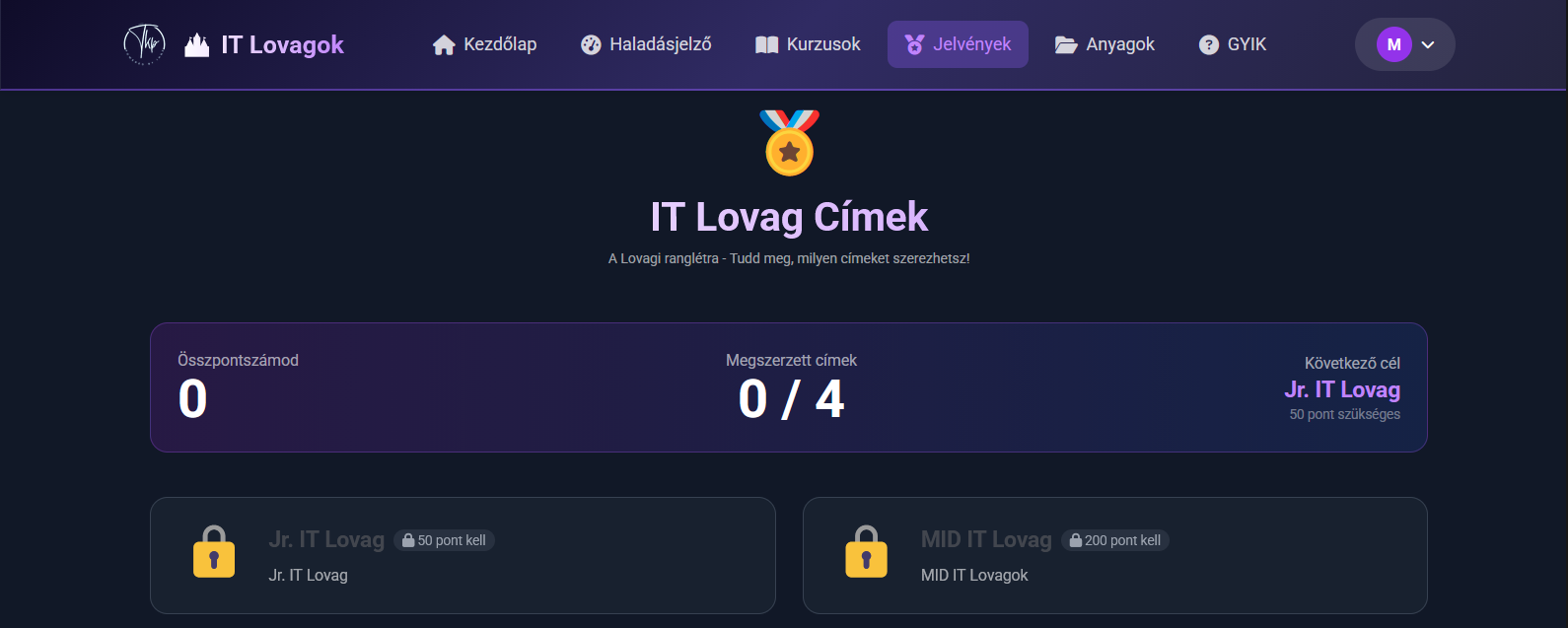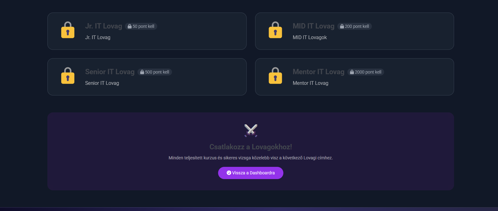 - 🏅 Cím- és jelvényrendszert működtet (Jr., MID, Senior, Mentor IT Lovag)